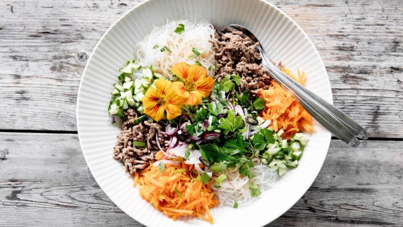 Dander i en stor serveringsbolle med risnudler, kjøtt og grønnsaker. Fordel dressingen over og topp med frisk koriander.