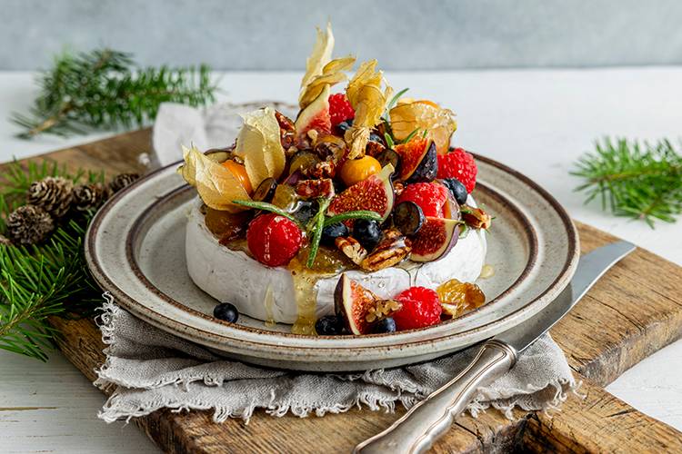 Bakt brie med honning, frukt og nøtter
