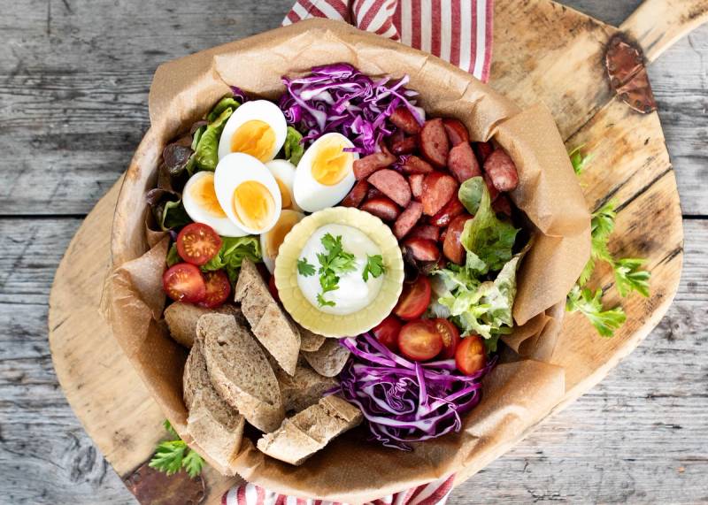 Dander salat, pølser, rødkål, tomater, egg og brød i en bolle og server med dressingen ved siden av.